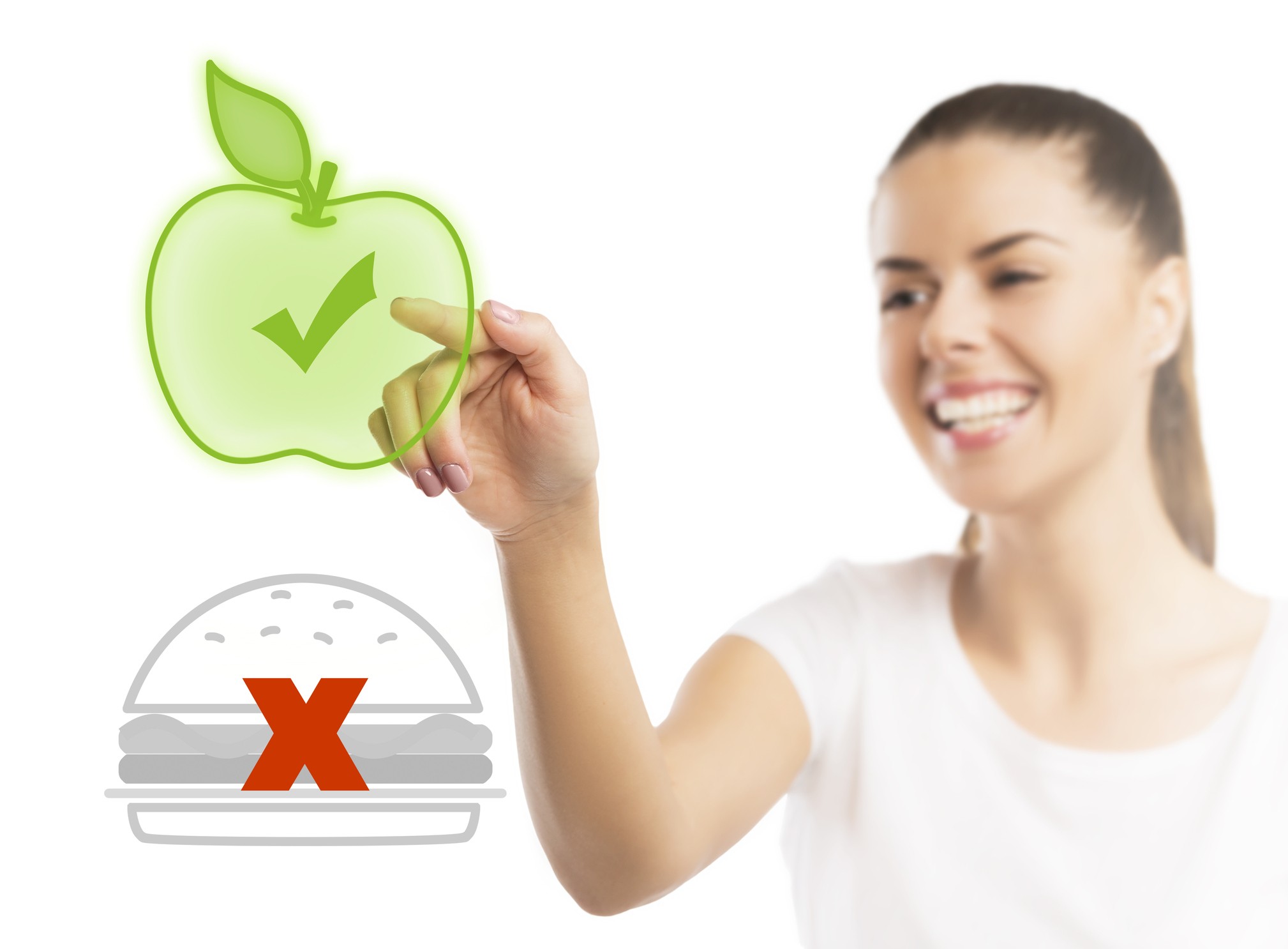 Beautiful woman choosing between healthy and unhealthy food
