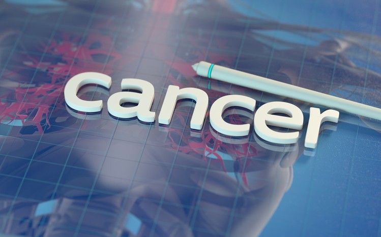 The word "cancer" on a reflective digital surface with anatomical imagery beneath.Medical technology. 3d illustration.The word "cancer" on a reflective digital surface with anatomical imagery beneath.Medical technology. 3d illustration.